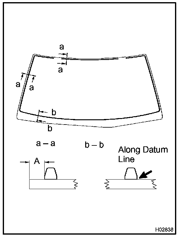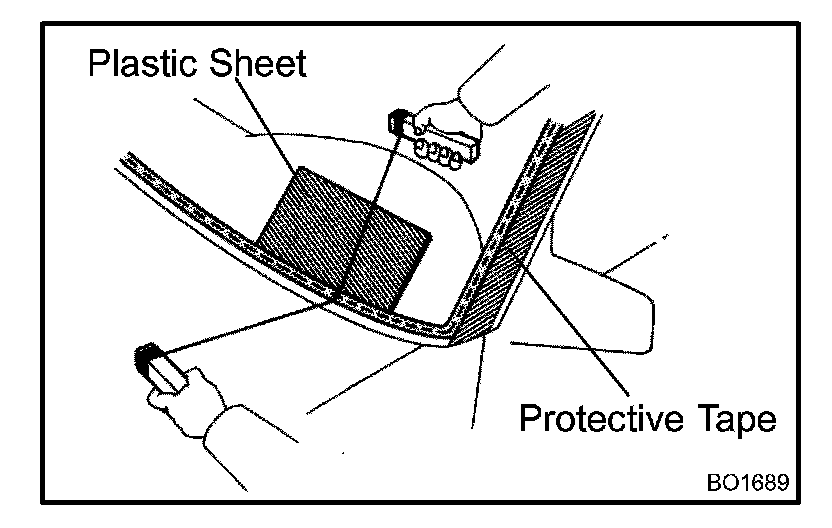 NOTE: When separating the glass, be careful not to damage the paint, interior and exterior ornaments. To prevent scratching the safety pad when removing the windshield, place a plastic sheet between the piano wire and safety pad.