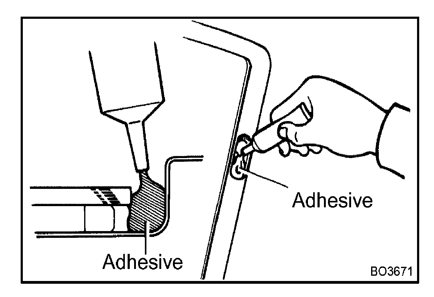 Apply adhesive to the moulding installation area between the glass and the body.
