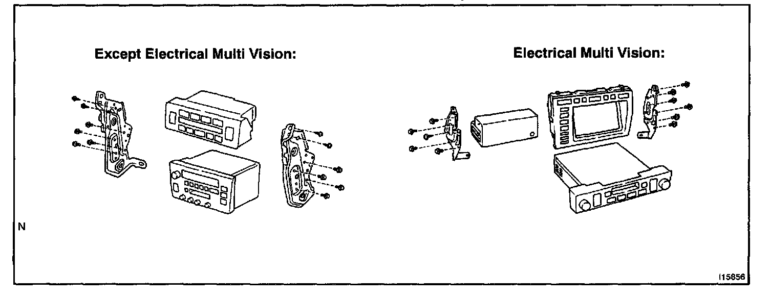 Remove the 8 bolts, 2 screw and 2 brackets, then remove the A/C control assembly.