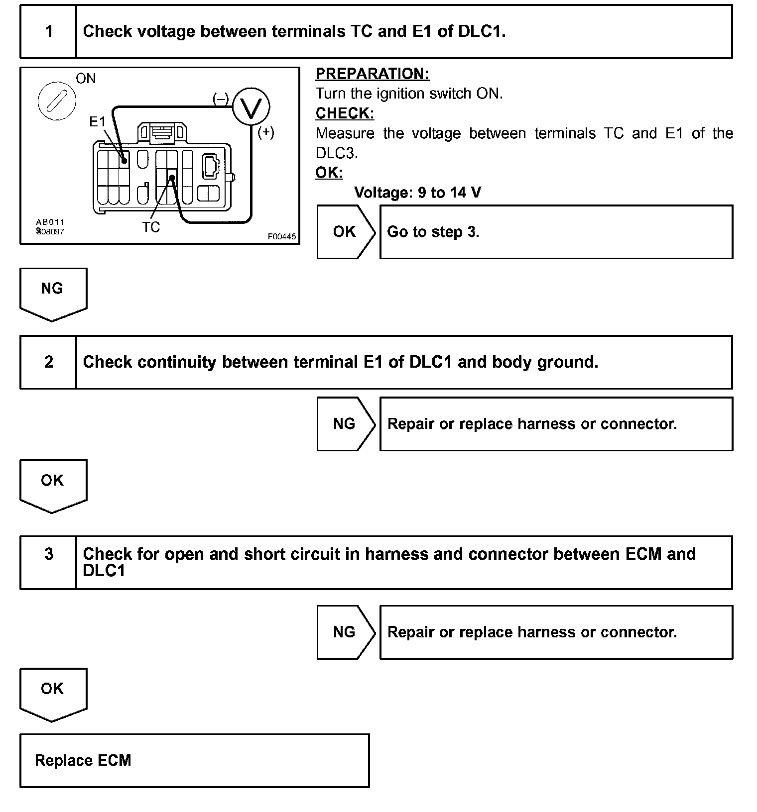 - For the phenomenon,an open or short in the wire harness, or malfunction inside the ECM is the likely cause.