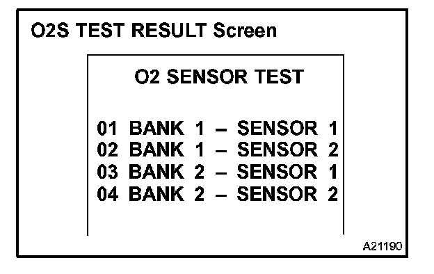 b. On the tester screen, select the following menus: DIAGNOSIS / CARB OBD II / O2S TEST RESULT. A list of the O2S equipped on the vehicle will be displayed.