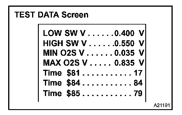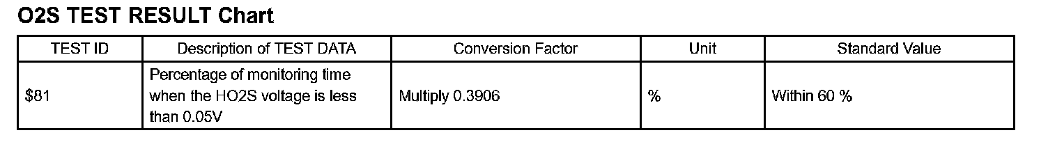 If the TEST DATA value appearing on the scan tool is out of the standard value, the O2S is malfunctioning. If it is within the standard value, the O2S is functioning normally. However, if the value is on the borderline of the standard value, the O2S may malfunction very soon.