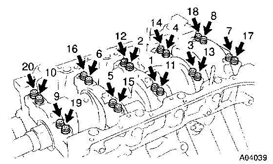 b. Install and uniformly tighten the 20 main bearing cap bolts in several passes, in the sequence shown.