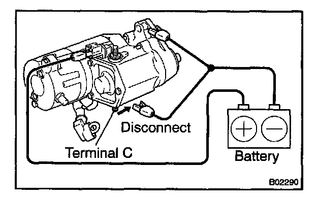 With battery connected as above with the clutch pinion gear out, disconnect the negative (-) lead from terminal C. Check that the pinion gear remains out.