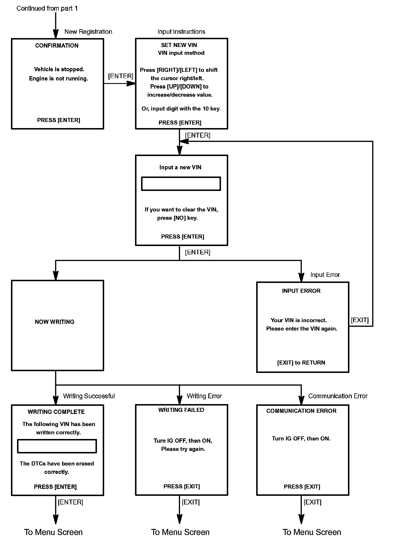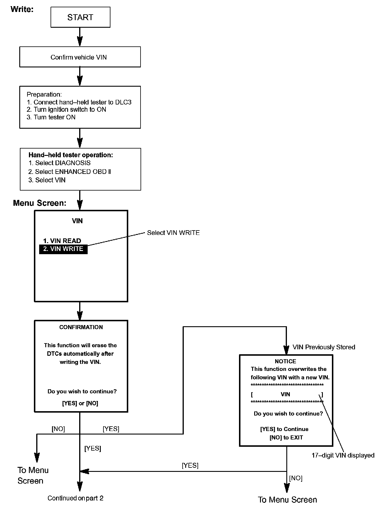c. Write VIN: Explains the VIN writing process in a flowchart. This process allows the VIN to be input into the ECM. If the ECM is changed, or the VIN and VIN do not match, the VIN can be registered, or overwritten in the ECM by following this procedure.