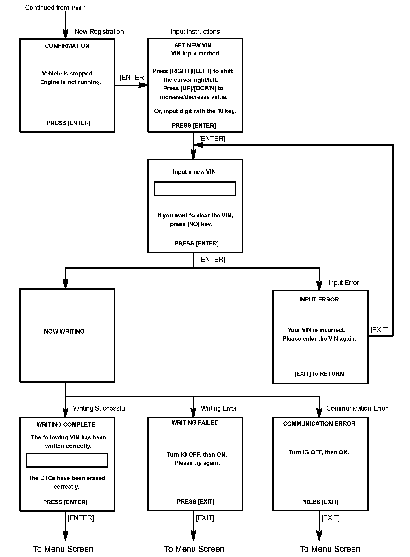 3. Write VIN: Explains the VIN writing process with the flowchart. This process allows the VIN to be input into the ECM. If the ECM is changed, or the VIN and VIN do not match, the VIN can be registered, or overwritten in the ECM by following this procedure.