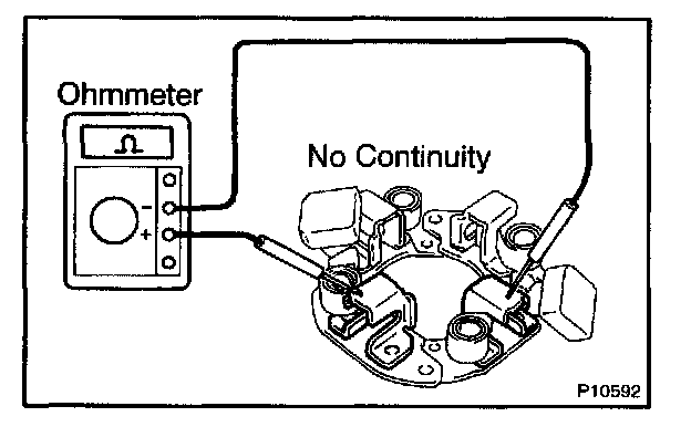 Check the brush holder insulator. Using an ohmmeter, check that there is no continuity between the positive (+) and negative (-) brush holders.