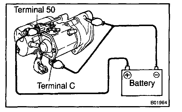 While connected as above with the pinion gear out, disconnect the negative (-) lead from terminal C.