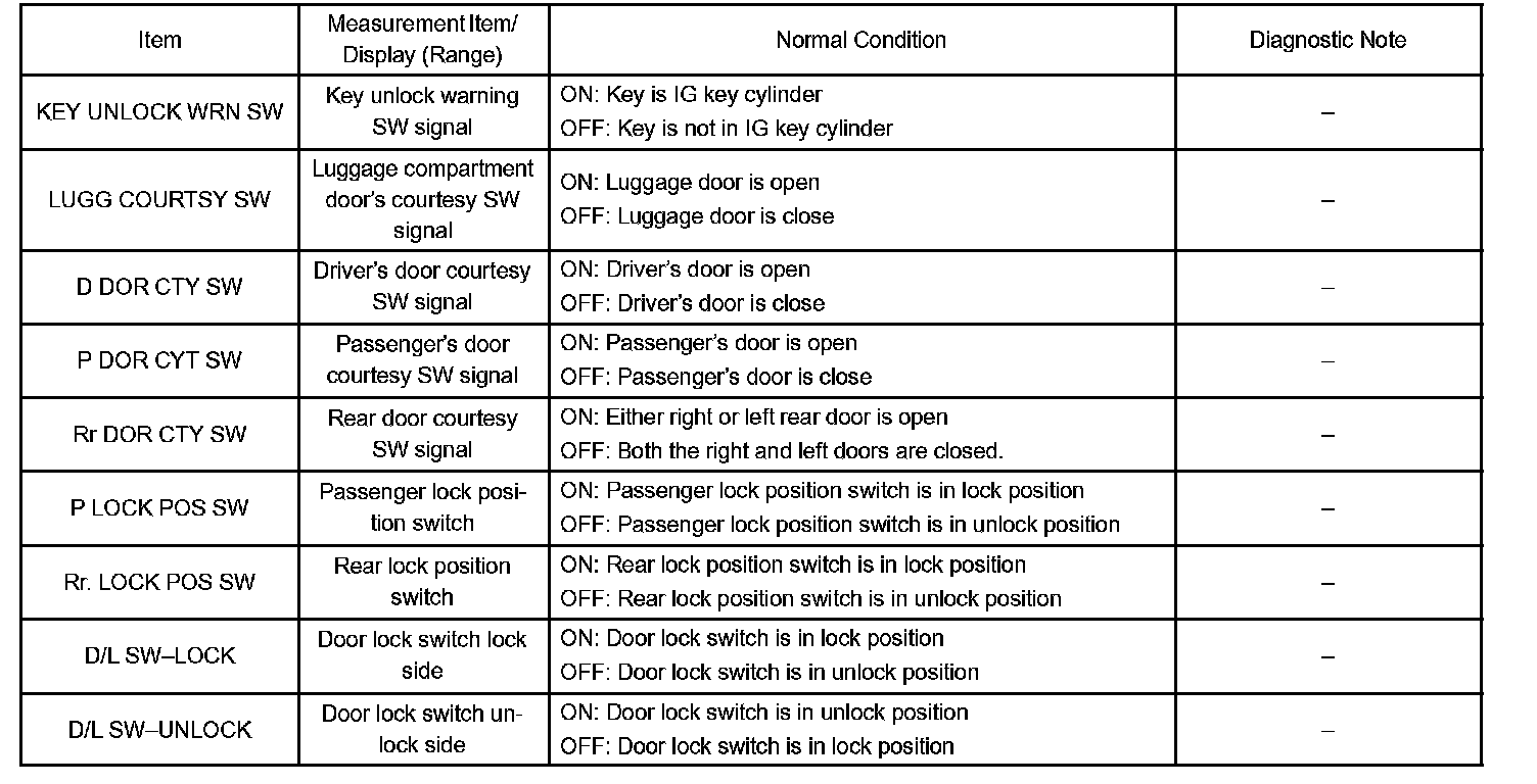 DATA LISTHINT: By the DATA LIST displayed on the hand-held tester, you can read the value of the switch, sensor, actuator and so on without removing any parts. Reading the DATA LIST as a first step of troubleshooting is one of the method to shorten the labor time.