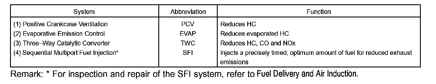 PURPOSEThe emission control systems are installed to reduce the amount of HC, CO and NOx exhausted from the engine ((3) and (4)), to prevent the atmospheric release of blow by gas containing HC (1) and evaporated fuel containing HC being released from the fuel tank (2).