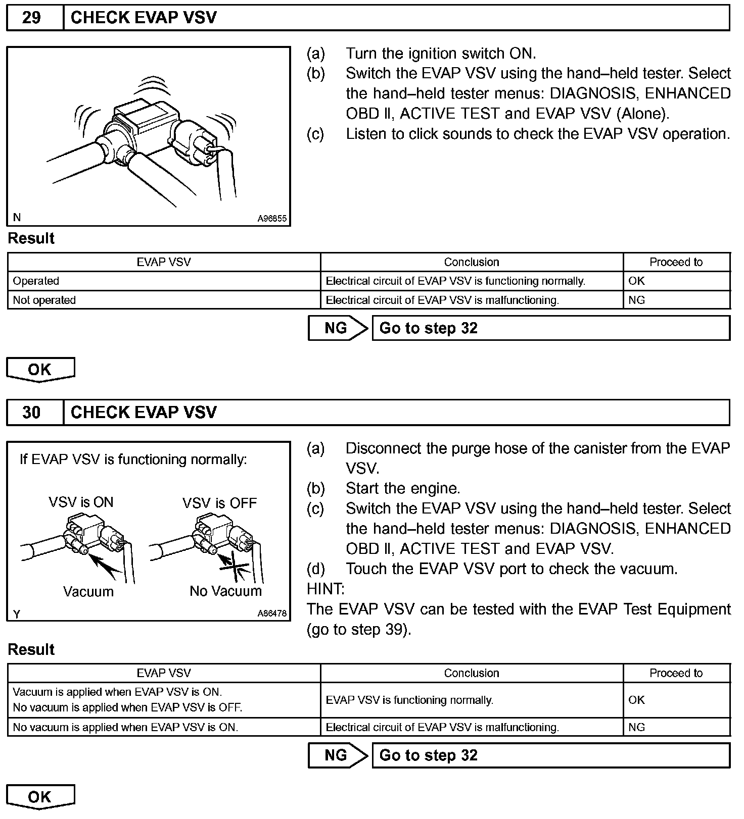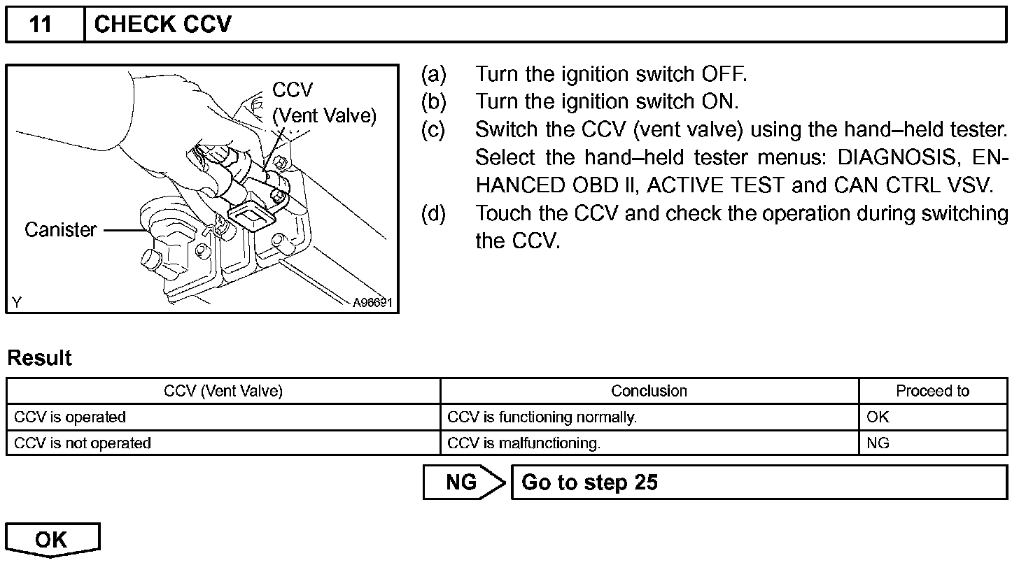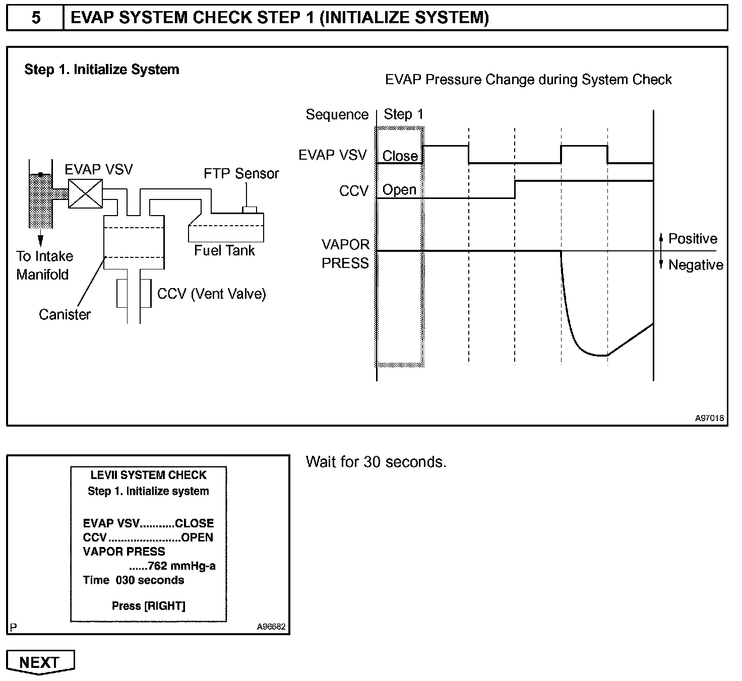 The EVAP monitor's purpose is to check for EVAP leaks and EVAP VSV and CCV malfunctions. The monitor performs the check by first introducing the intake manifold's negative pressure (vacuum) to the EVAP system. Then, the monitor records change in the EVAP system's pressure levels. The monitor runs when the following conditions are met: