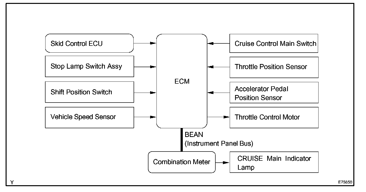 - The ECM illuminates the combination meter's CRUISE main indicator lamp when it receivers the cruise control main switch ON signal.