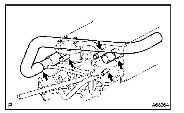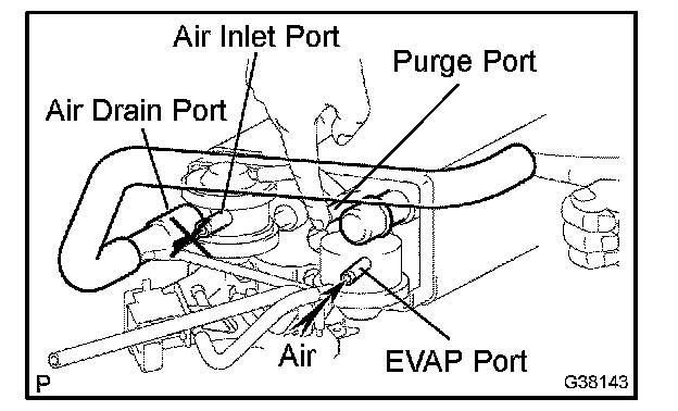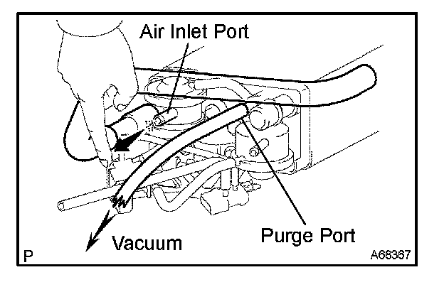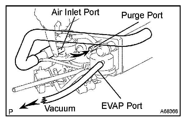 5. While holding the air inlet port closed, apply vacuum (3.43 kPa (25.7 mmHg, 1.01 in.Hg)) to the EVAP port. Check that air flows into the purge port.