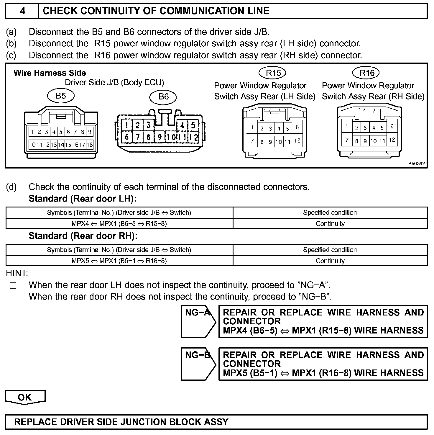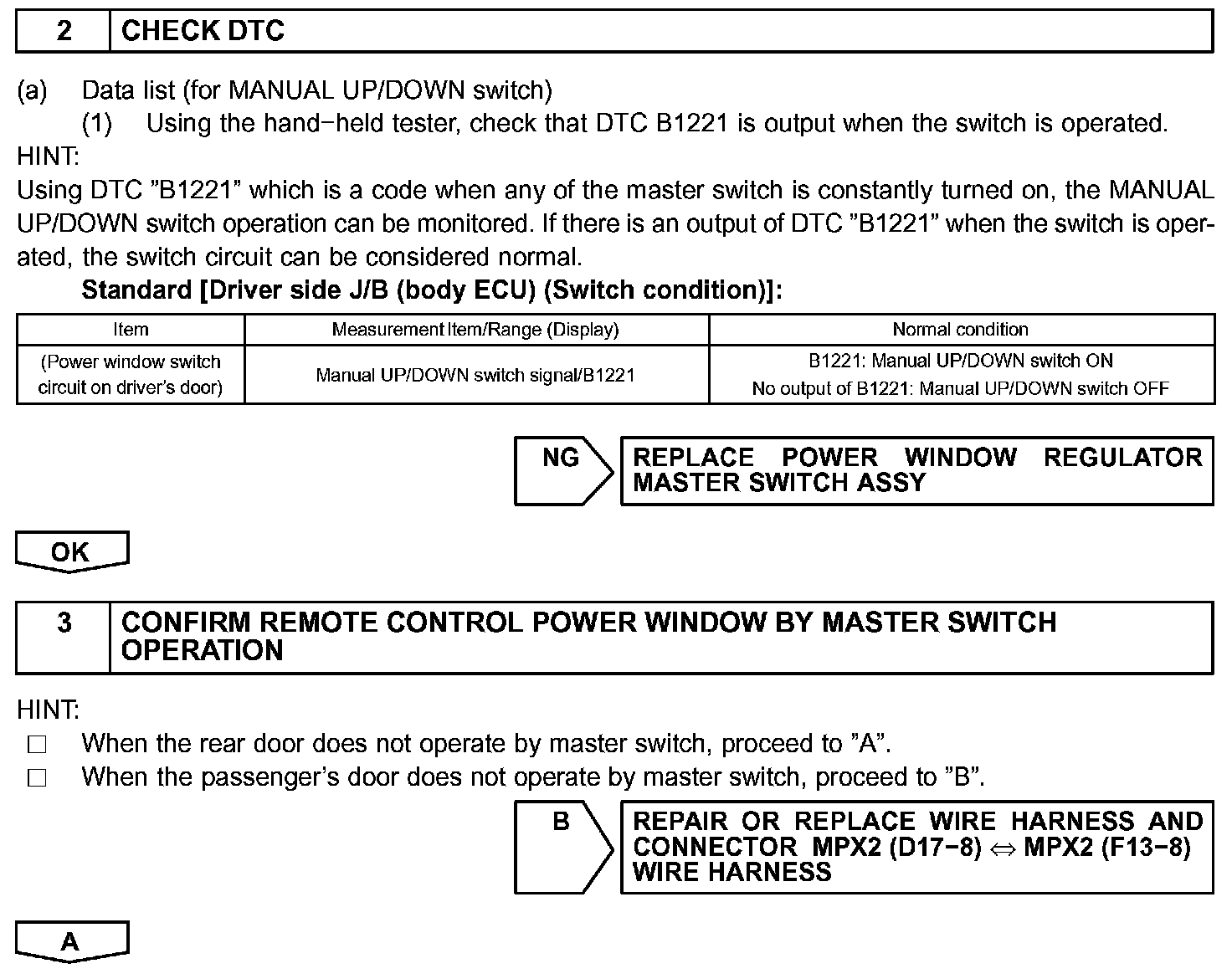 NOTE: Power window system has a function with a large-scale body multiplex communications. First of all, inspect the communication function depending on the "how to proceed with troubleshooting", and check that there is no abnormality in the communication system. Then finally proceed with the troubleshooting. Also, if the power window system has a malfunction in the jam protection function, the AUTO operations are prohibited. Because of this, confirm the diagnostic code is normal before the troubleshooting.
