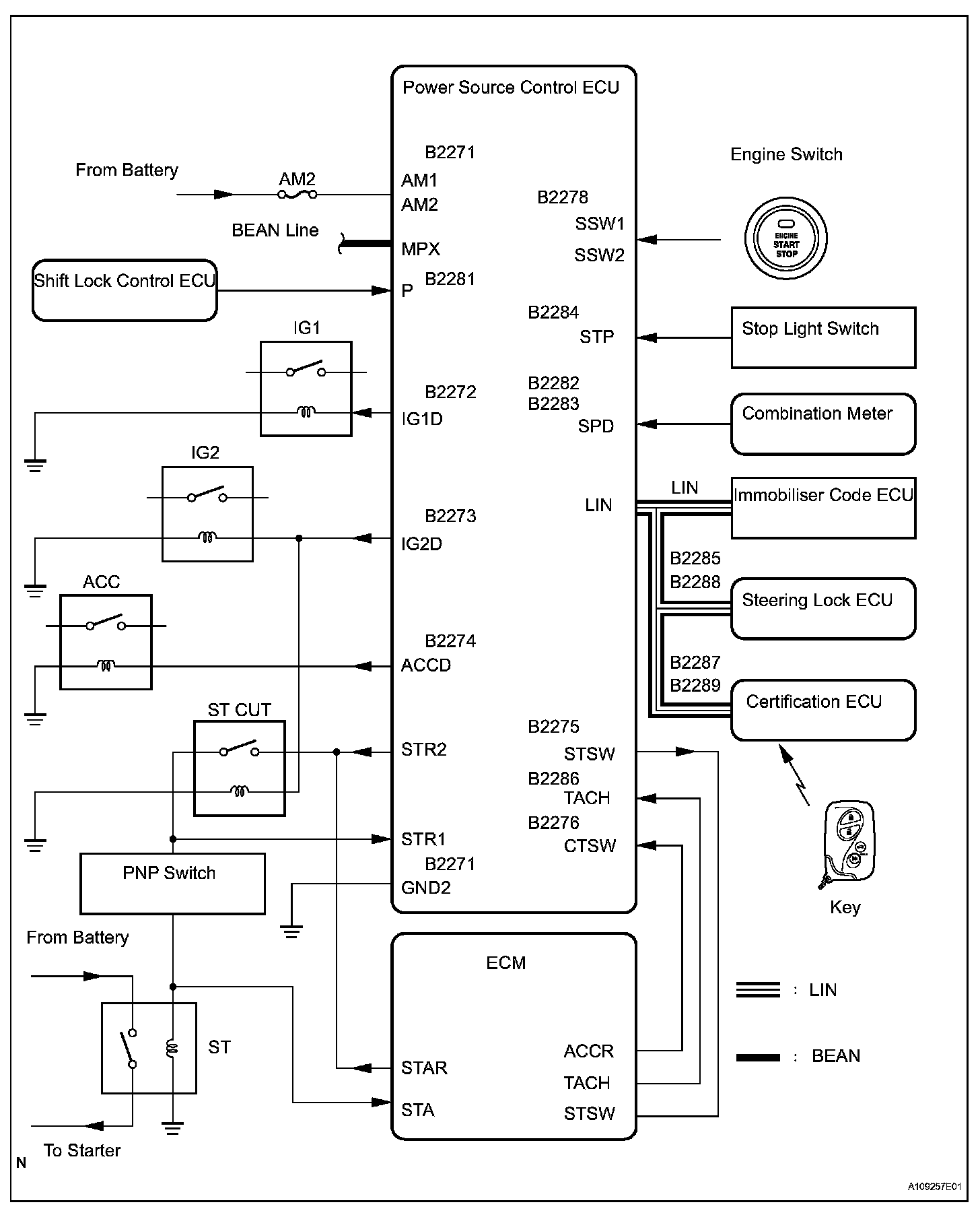a. If the engine switch is pressed with the shift lever in P or N and the brake pedal depressed, the power source control ECU determines that it is an engine start request.