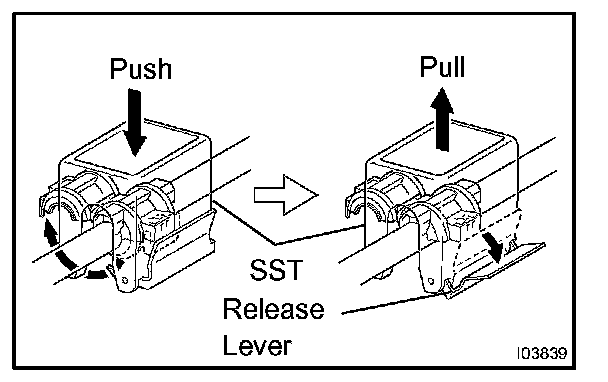 c. Pull SST slightly and push the release lever, and then remove the piping clamp with SST.