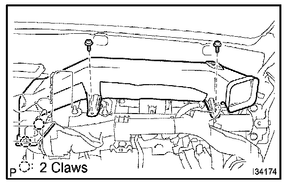 a. Release the 2 claw fittings and remove the 2 screws and the heater to register duct No.2.