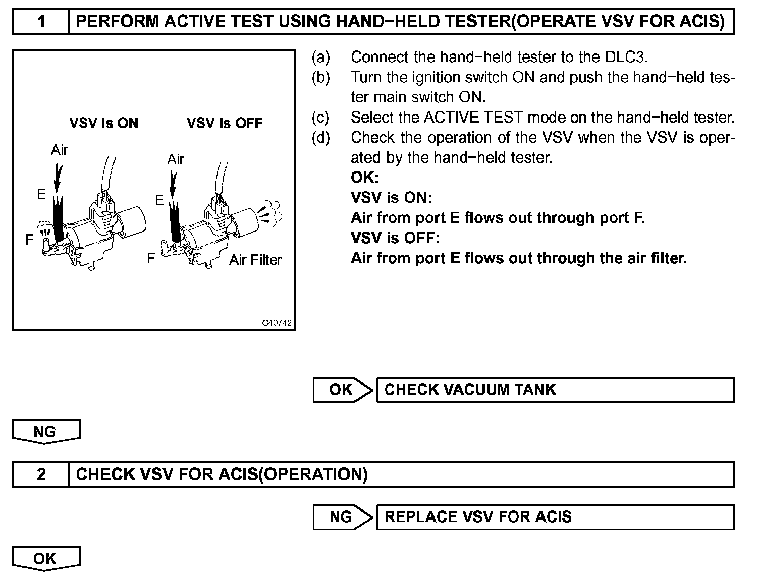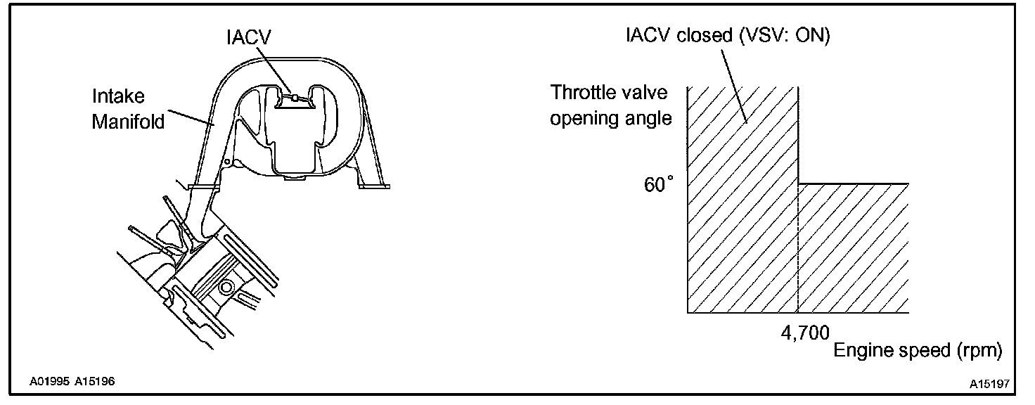 When the engine speed is 4,700 rpm or more and the throttle valve opening angle is 60 degrees or more, the VSV is OFF, so the is IACV open. All the other times, the ECM turns the VSV ON and closes the IACV.