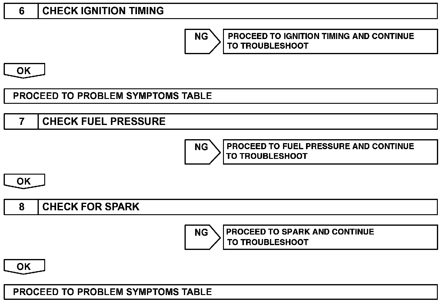 When the malfunction is not confirmed in the DTC check, troubleshooting should be carried out in all the possible circuits considered as causes of the problem. In many cases, by carrying out the basic engine check shown in the flowchart, the location causing the problem can be found quickly and efficiently. Therefore, using this check is essential in the engine troubleshooting.