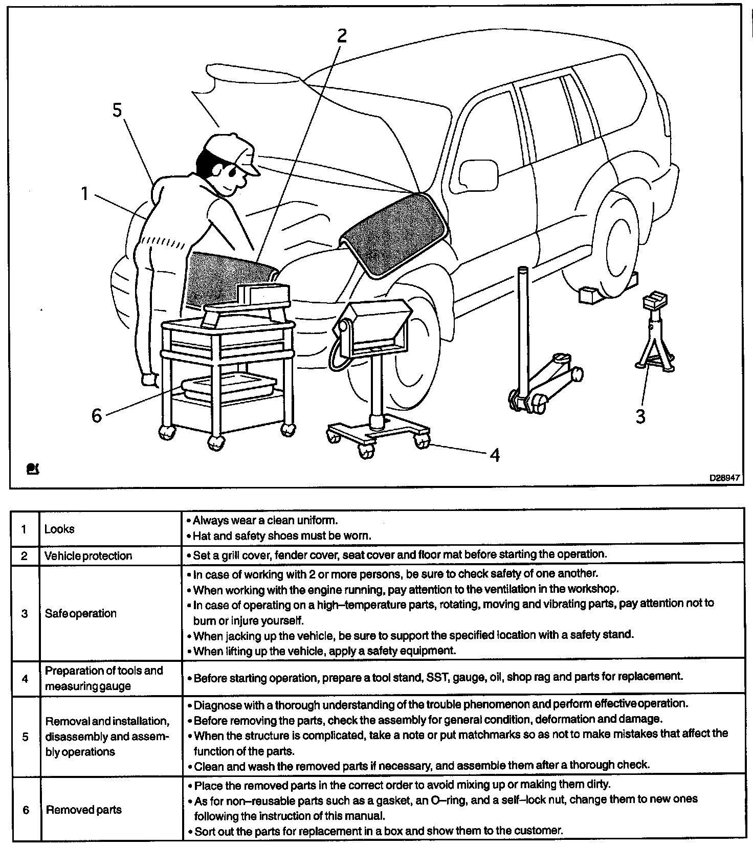 1. Care must be taken when jacking up and supporting the vehicle. Be sure to lift and support the vehicle at the proper locations