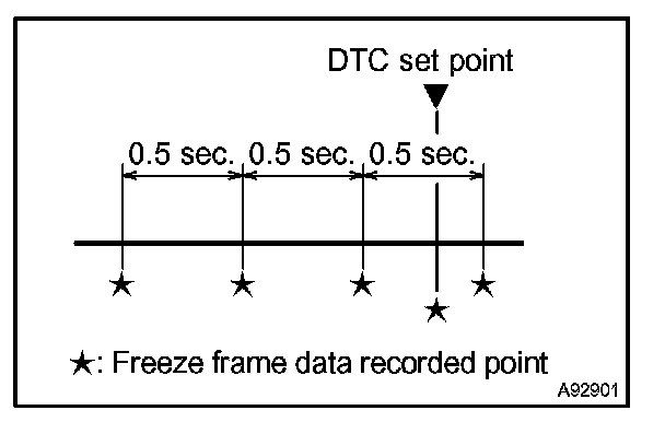 The intelligent tester displays freeze frame data recorded at five different points: 1) 3 times before the DTC is set, 2) once when the DTC is set, and 3) once after the DTC is set. The data can be used to simulate the vehicle's condition around the time of the malfunction. The data may be helpful in determining the cause of a malfunction. It may also be helpful in determining whether a DTC is being caused by a temporary malfunction.