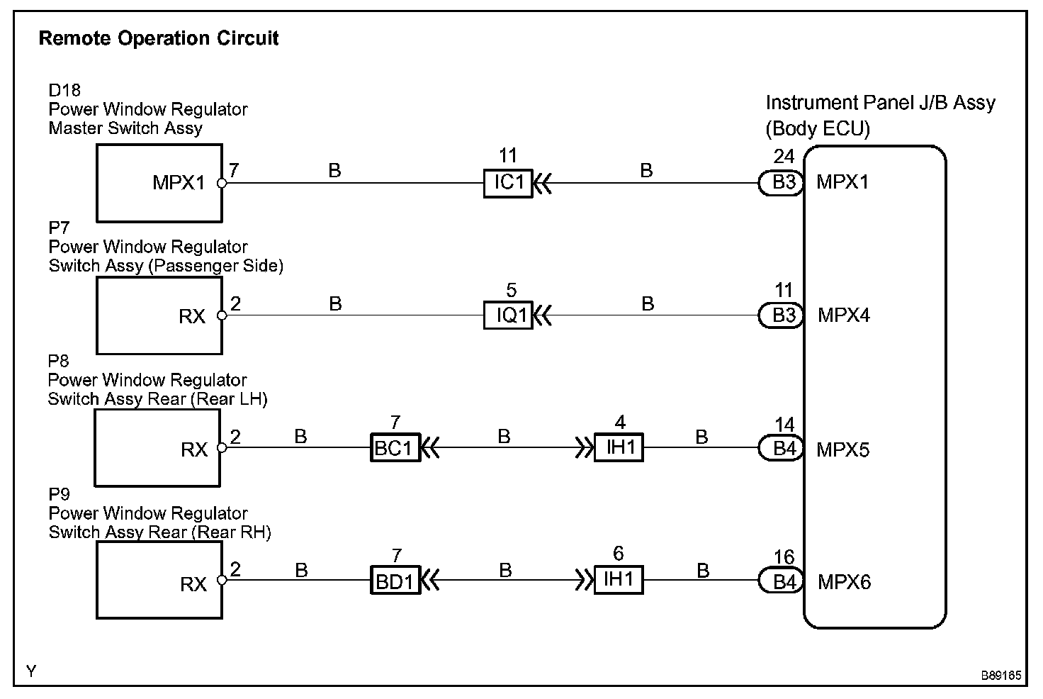 If the remote control does not operate, the remote function may have been disabled by a malfunction that was detected in the power window circuit. Also, when any power window switch or the wire harness has a malfunction, the remote control for the applicable power window does not function.