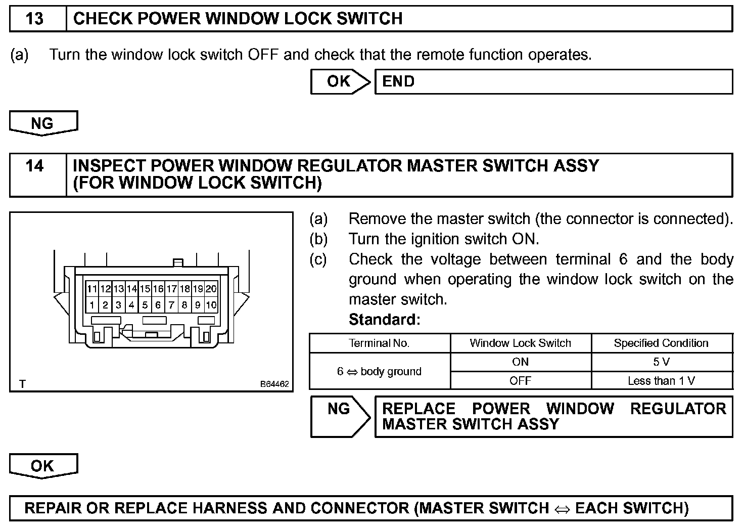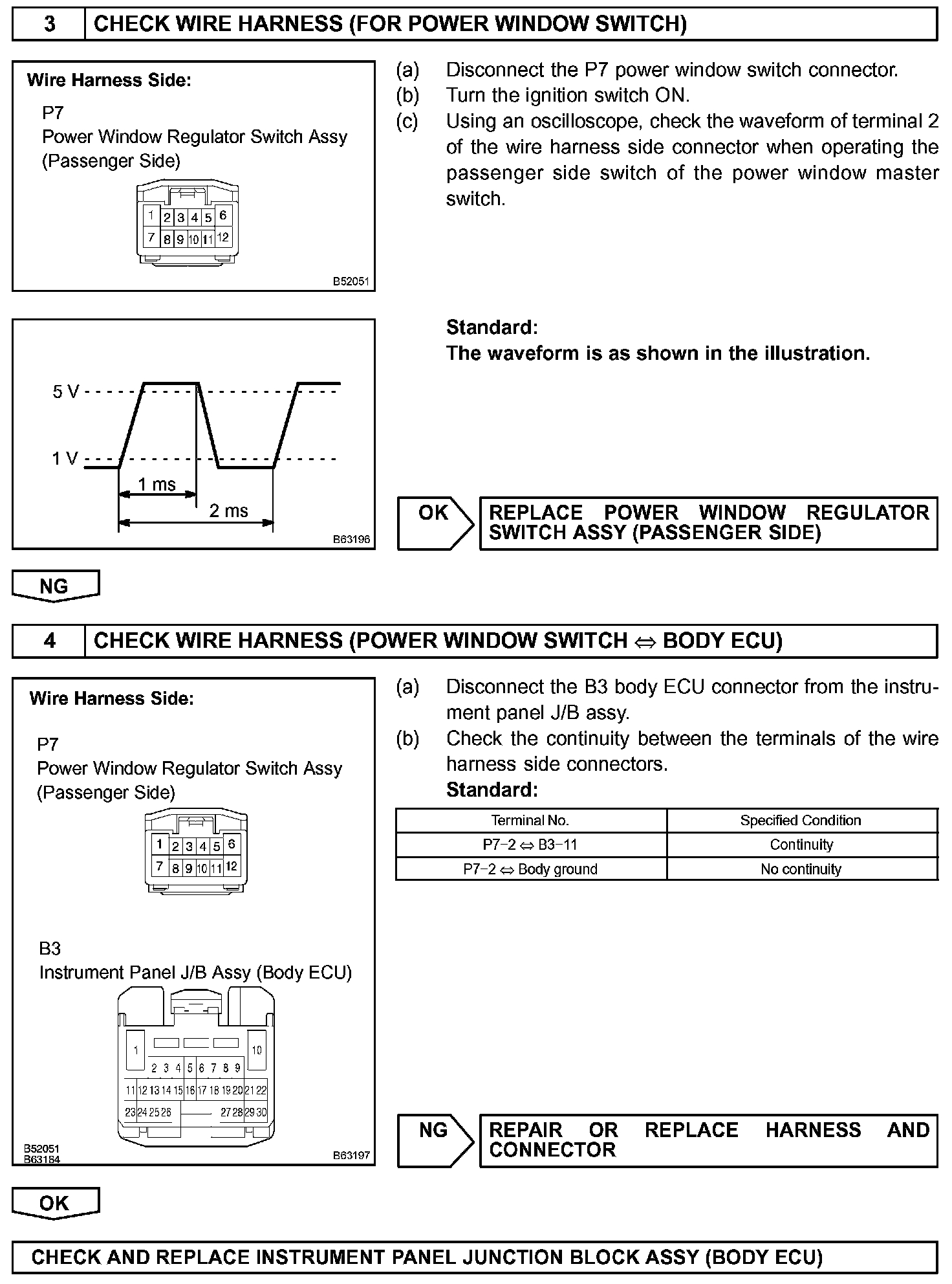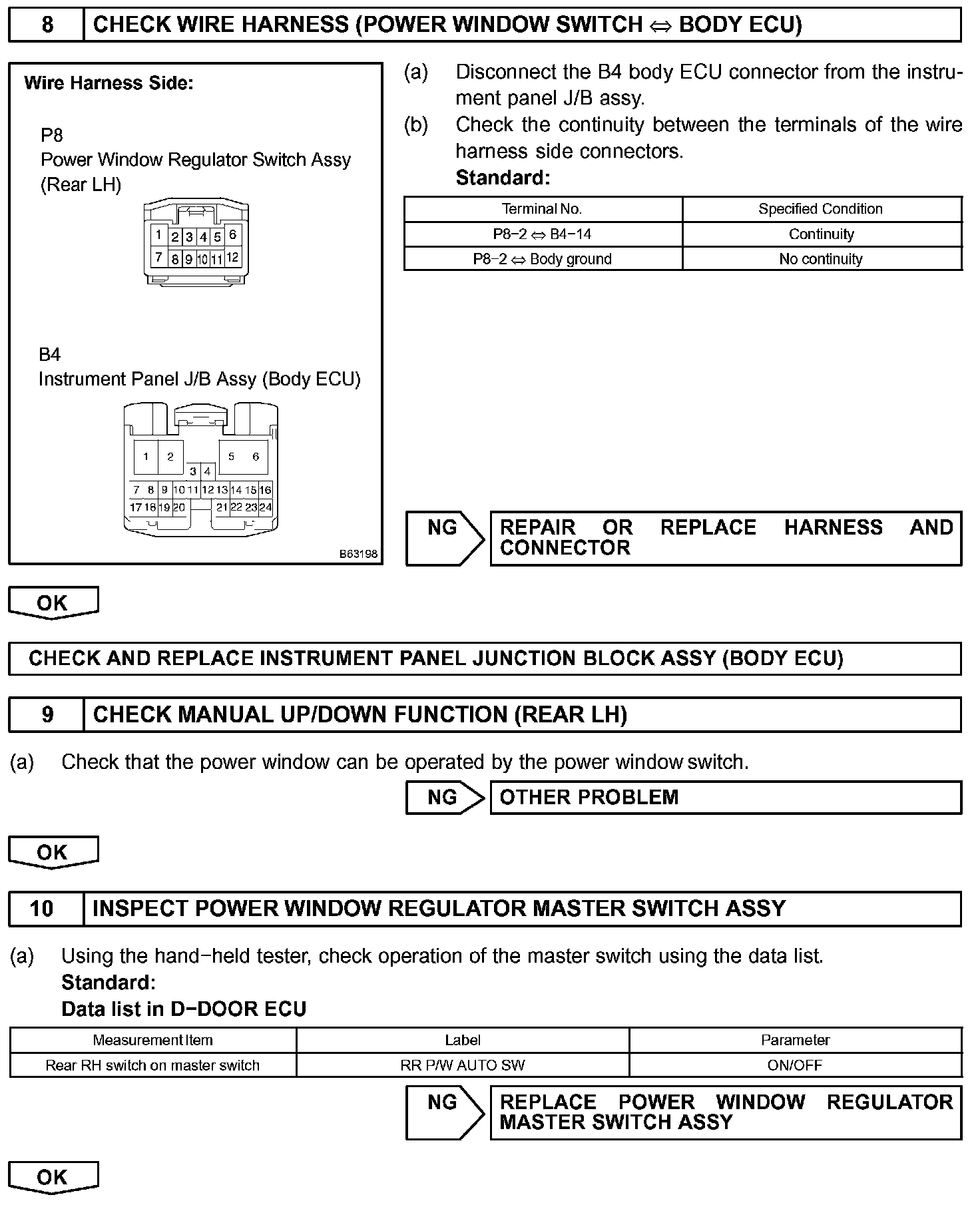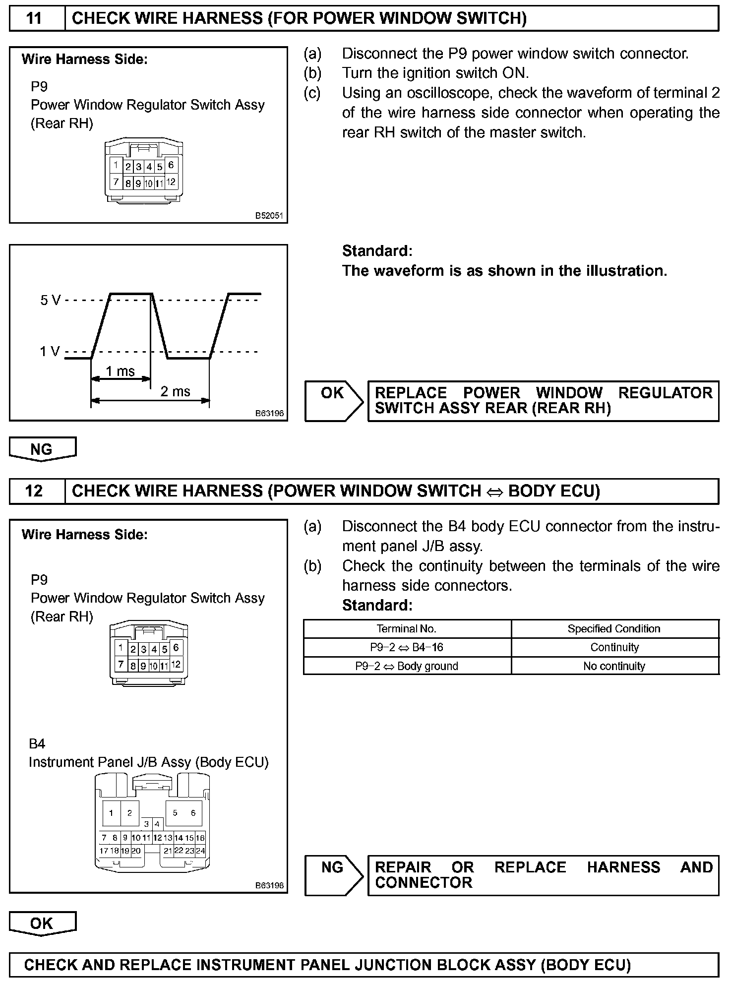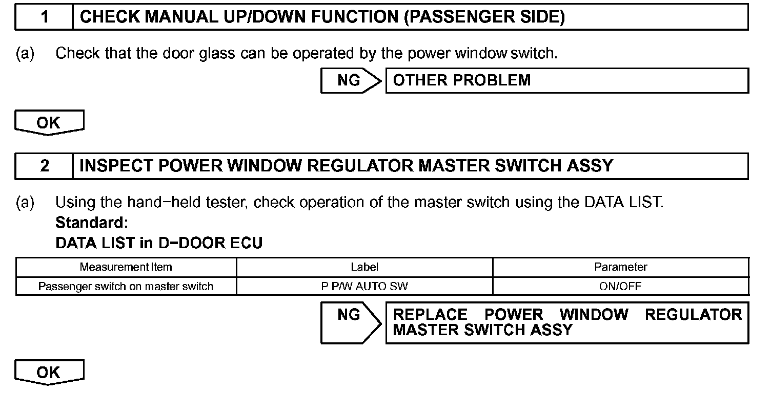 HINT: Check which power window cannot be operated, and then proceed with the troubleshooting for the applicable power window as shown in the table.