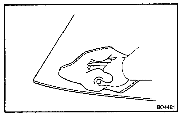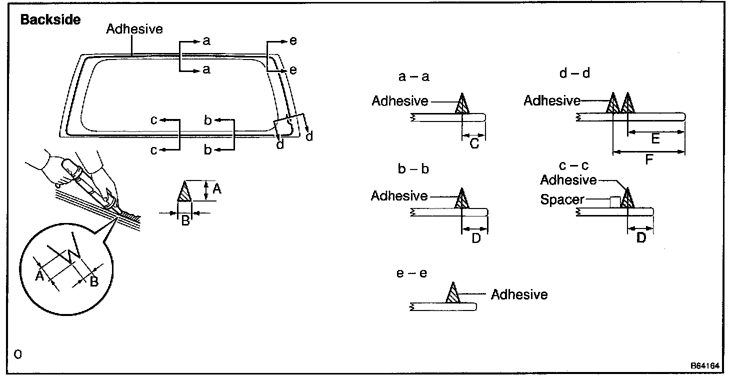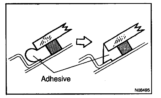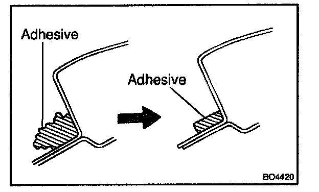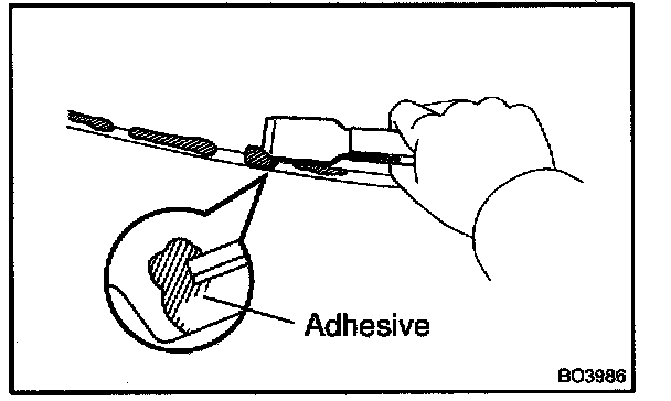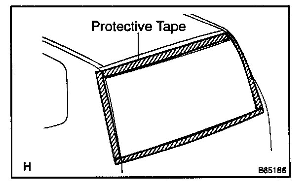 1. Hold the back window glass in place securely with tape or equivalent to the body until the adhesive has hardened.