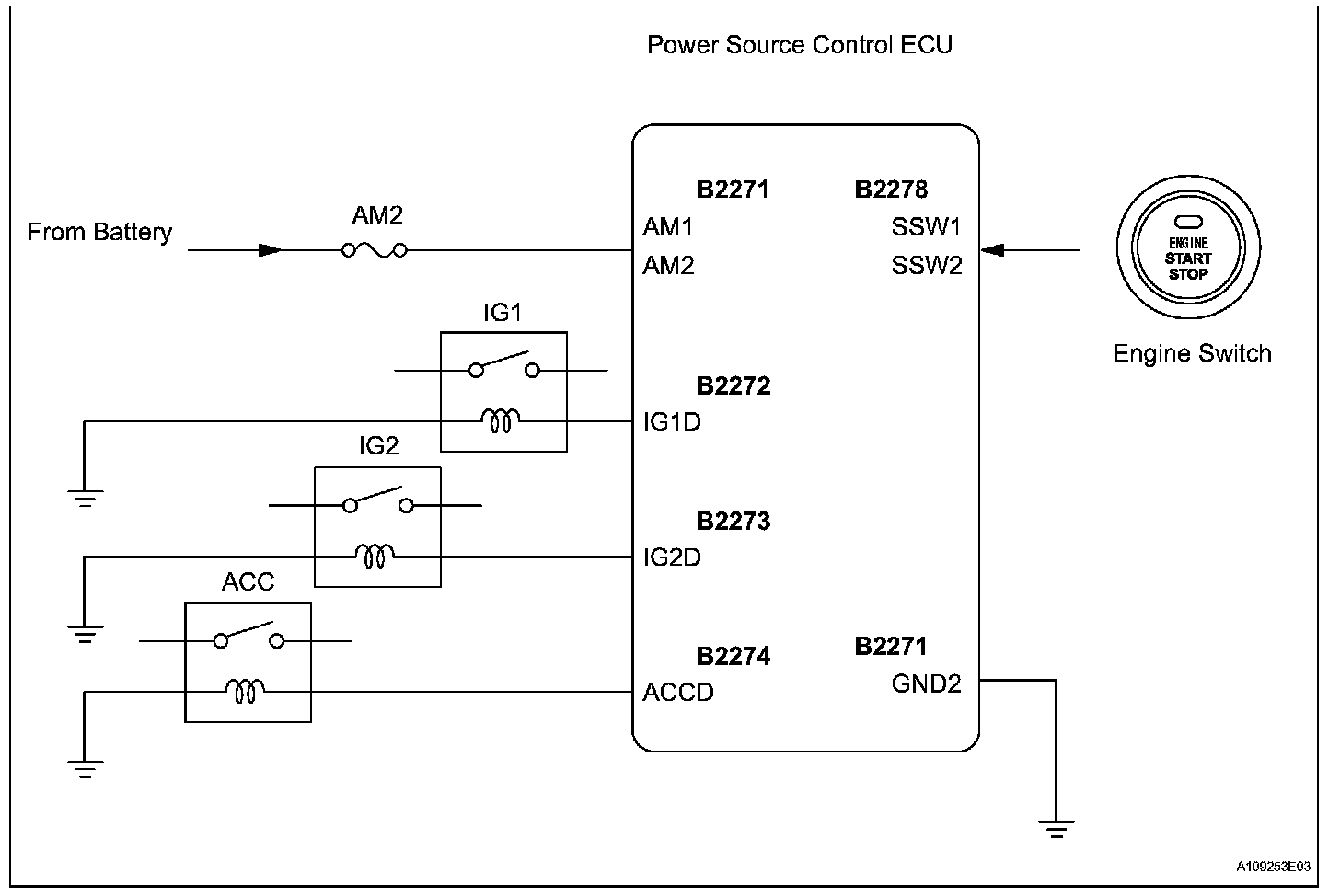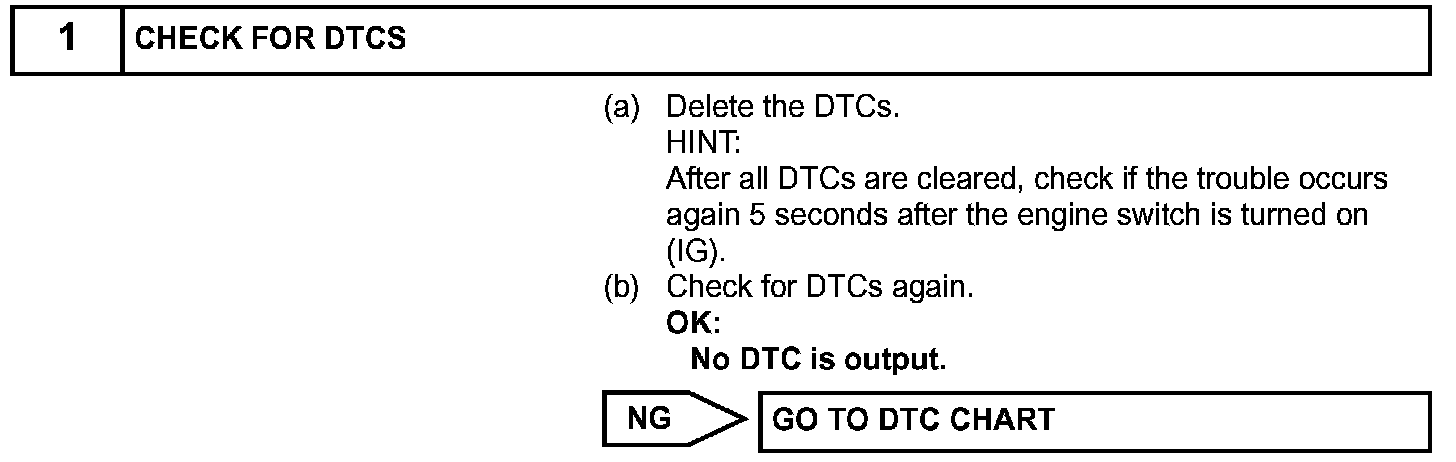 If the certification ECU detects the key inside the vehicle when the shift lever position is P (A/T) and the brake pedal (A/T) or the clutch pedal (M/T) is not depressed, each press of the engine switch changes the power source mode in the given order: off, on (ACC), on (IG), off. If one of the DTCs shown in the given illustration is detected, correct the DTCs according to the DTC chart. If the power source mode is still malfunctioning, one of the following may have occurred: 1) the MPX circuit has a malfunction, 2) the certification ECU has determined that the electrical key is not inside the vehicle, 3) the engine switch has a malfunction, or 4) the power source control ECU has a malfunction.