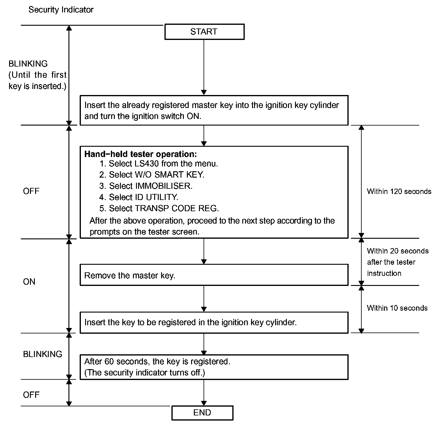 - A brief outline of procedures for key code registration is shown. For more detailed information, please refer to the hand-held tester screen's instructions.