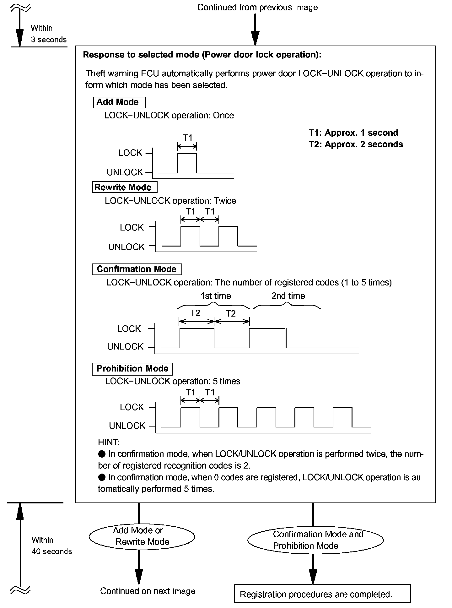 - Add mode is used to register new recognition codes while still retaining codes already registered. This mode is used when a new transmitter is added. If the number of registered codes exceeds 4, the previously registered codes will be erased, starting from the first registered code.