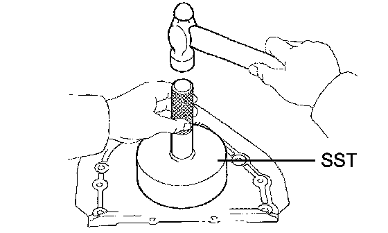 2 Using SST and a hammer, tap in a new oil seal until its surface is flush with the rear oil seal retainer edge.