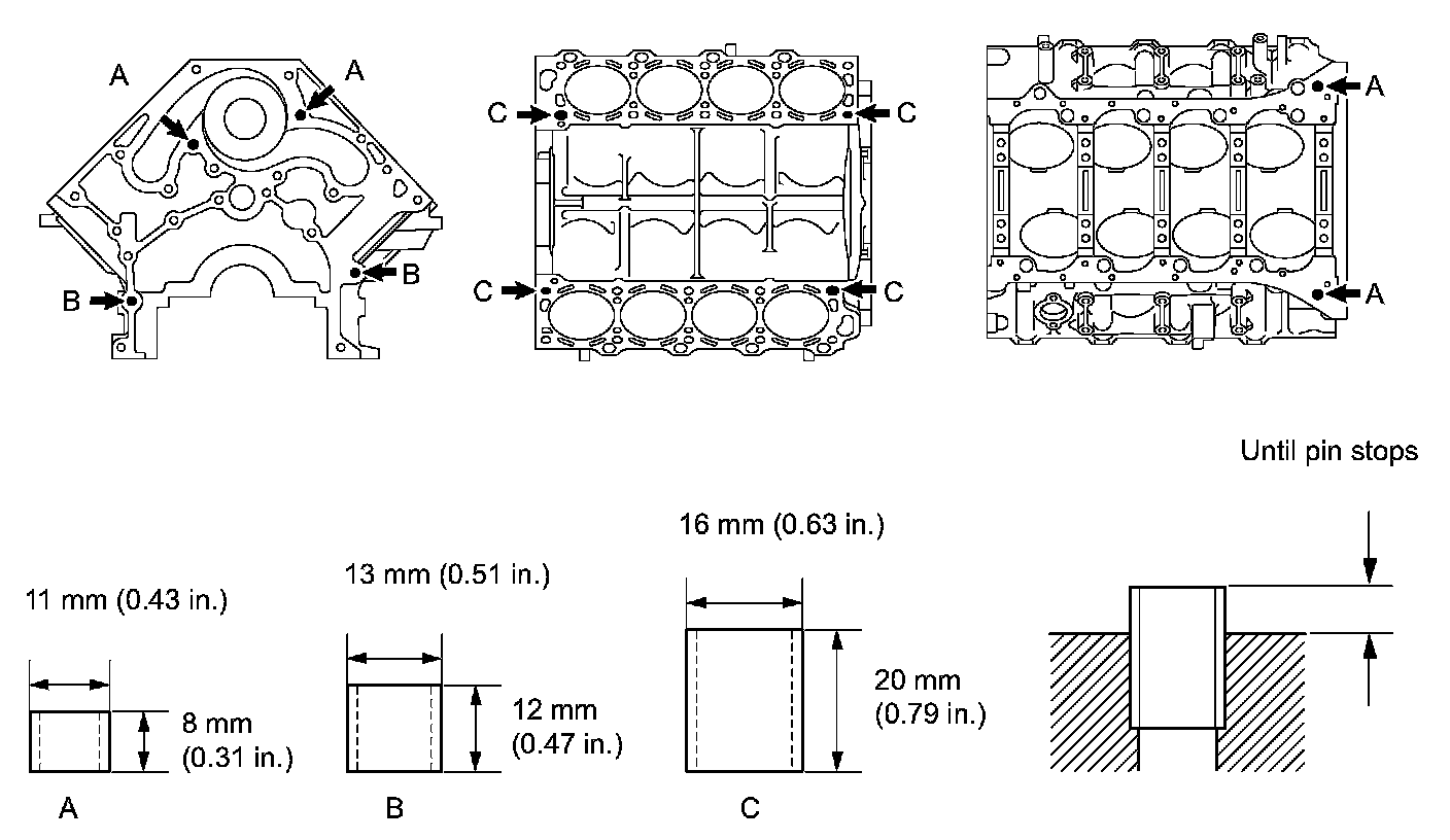 ^ Main bearings come in widths of 19.5 mm (0.768 inch) and 22.5 mm (0.886 inch). Install the 22.5 mm (0.886 inch) bearings in the No. 1 and No. 5 cylinder block journal positions with the crankshaft bearing cap. Install the 19.5 mm (0.768 inch) bearings in the other positions.