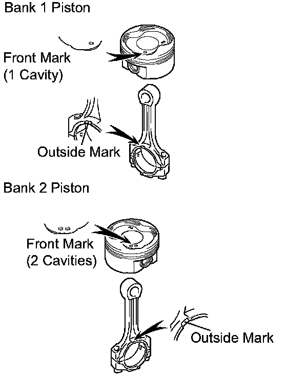 NOTICE: The installation directions of the piston and connecting rod are different for the bank 1 and bank 2. The bank 1 piston is marked with 1 cavity and LH, the bank 2 piston with 2 cavities and RH.