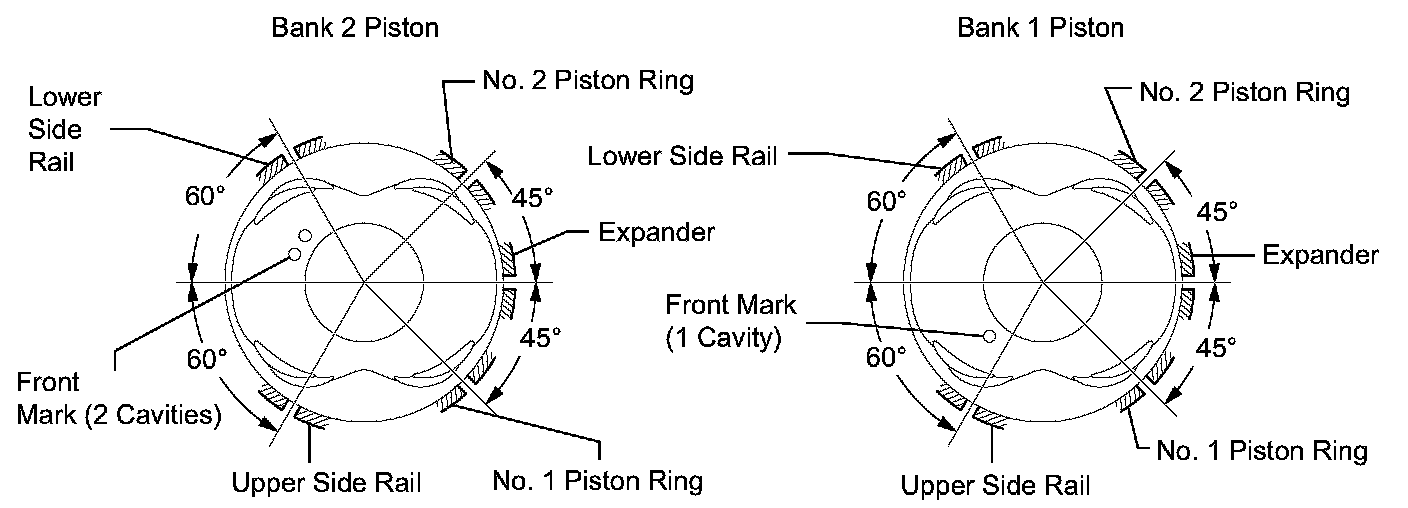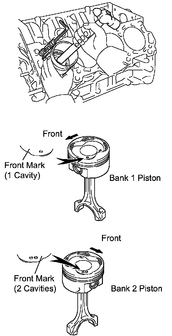 NOTICE: The shape of the piston varies for the bank 1 and bank 2. The bank 1 piston is marked with 1 cavity and LH the bank 2 piston with 2 cavities and RH.