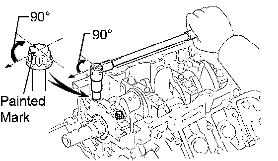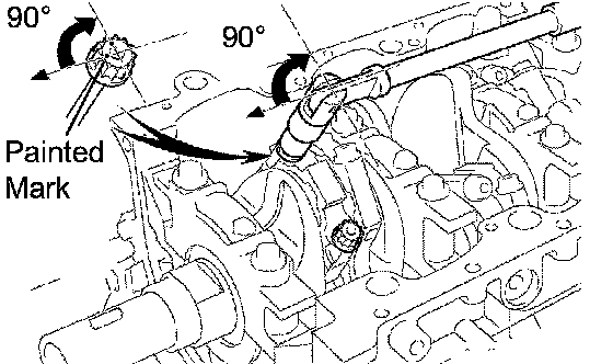 4 Tighten the crankshaft bearing cap bolts another 90° as shown in the illustration.