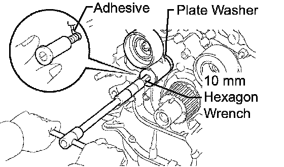 b. Using a 10 mm hexagon wrench, install the plate washer and idler with the pivot bolt.