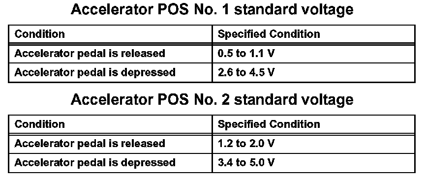 e. When depressing and releasing the accelerator pedal, check that the values of the accelerator POS No. 1 and POS No. 2 are within the specification.