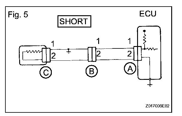CHECK FOR SHORT CIRCUITa. If the wire harness is ground shorted (Fig. 5), locate the section by conducting a resistance check with the body ground (below).