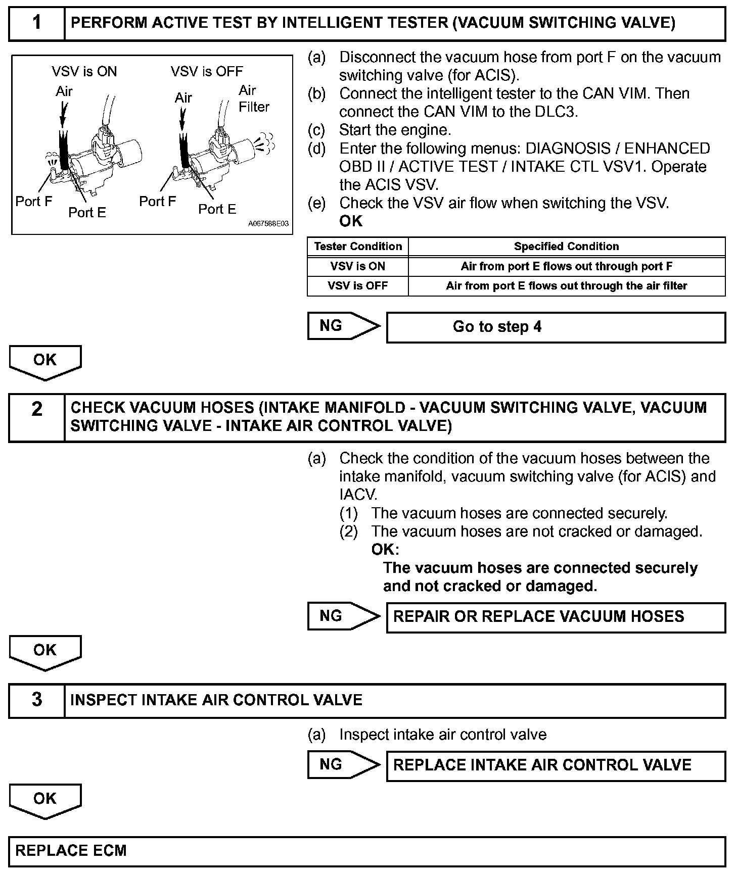 When the engine speed is 4,700 rpm or more and the throttle valve opening angle is 60 degree or more, the IACV is open (VSV: OFF). At all other times, the IACV is closed (VSV: ON).