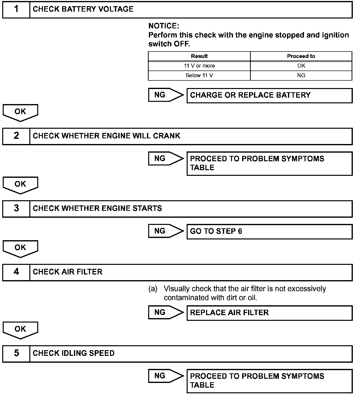 When the malfunction is not confirmed by the DTC check, troubleshooting should be carried out in all circuits considered to be possible causes of the problem. In many cases, by carrying out the basic engine check shown in the flowchart, the location of the problem can be found quickly and efficiently. Therefore, using this check is essential when engine troubleshooting.