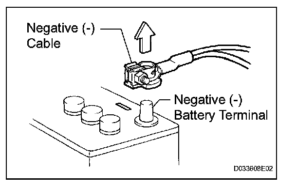 1. Before performing electronic work, disconnect the cable from the negative (-) battery terminal to prevent component and wire damage caused by accidental short circuits.