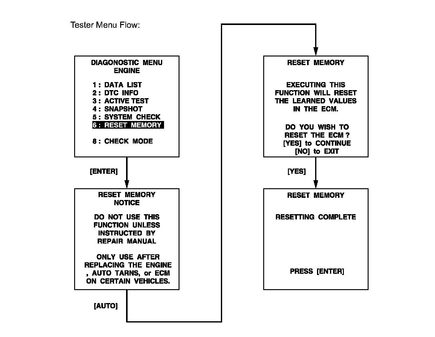 CAUTION: After performing the RESET MEMORY procedures, be sure to perform the ROAD TEST as described earlier. Road Test