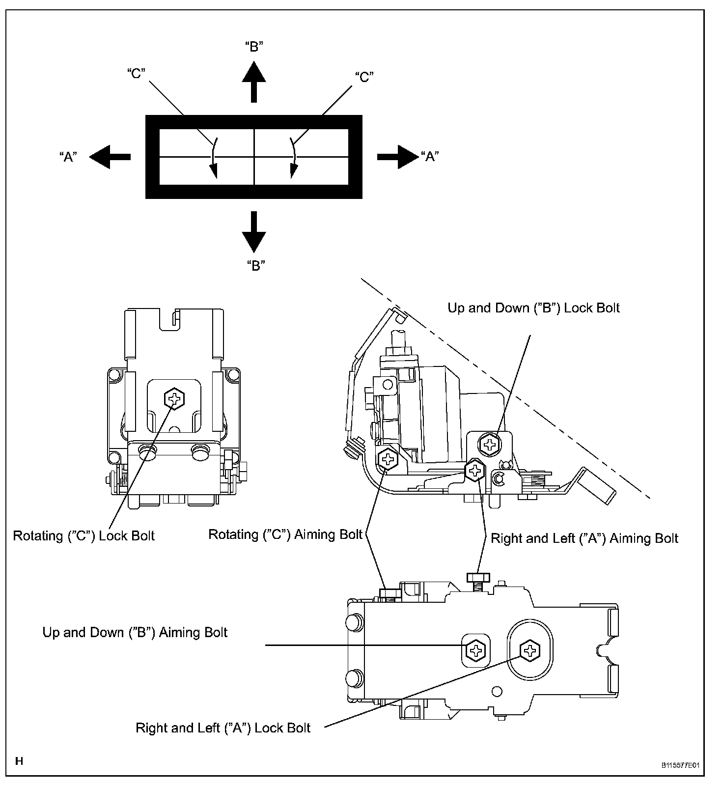 HINT: When adjusting in all 3 directions, follow this order: right and left ("A"), up and down ("B"), and rotating ("C").