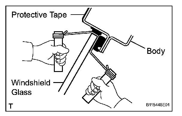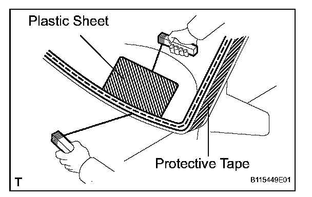 NOTE: When separating the glass, take care not to damage the paint and interior and exterior ornaments. To prevent scratching the safety pad when removing the windshield, place a plastic sheet between the piano wire and safety pad.
