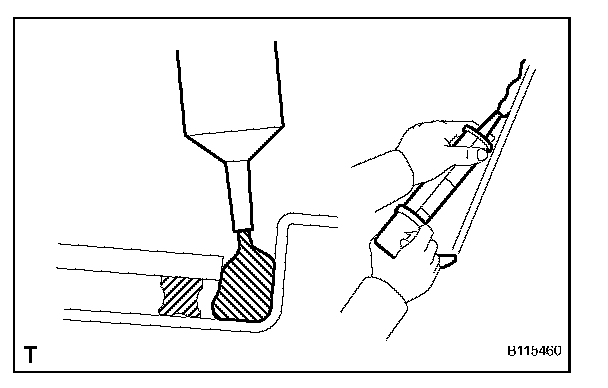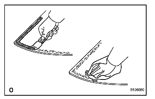 1. On the contact surface of the vehicle body, use a knife to cut away excess adhesive as shown in the illustration.