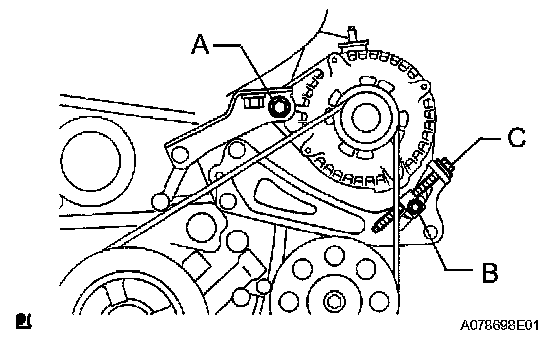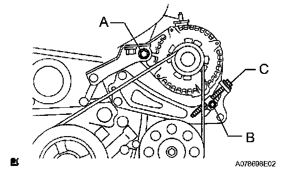 b. Tighten the adjusting bolt C, and adjust the V-ribbed belt tension.