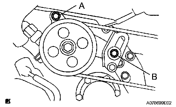b. Using a bar, adjust the V-ribbed belt tension and tighten bolt B.