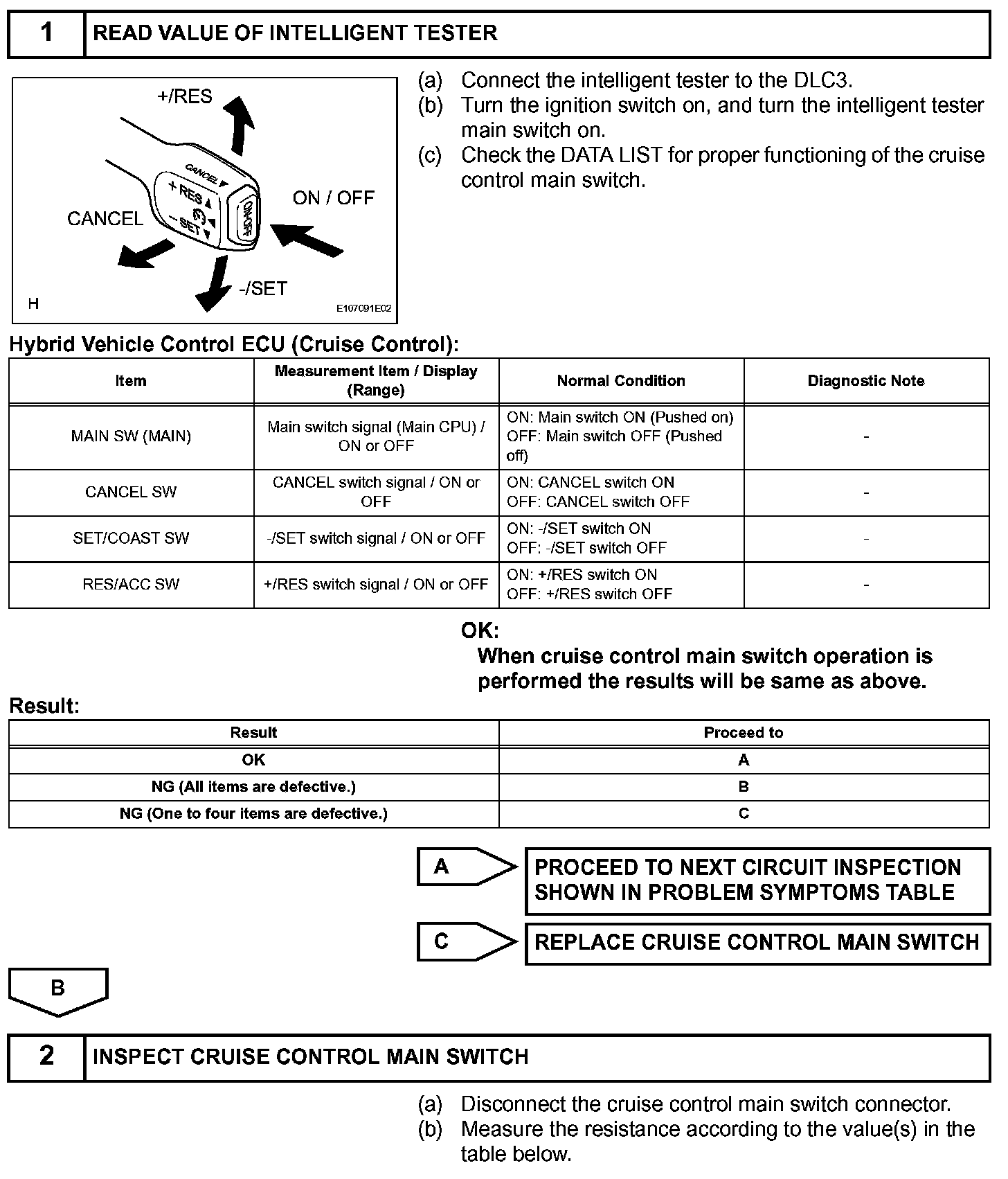 The cruise control main switch operates 7 functions: SET, COAST, TAP-DOWN, RESUME, ACCEL, TAP-UP, and CANCEL. The SET, TAP-DOWN and COAST functions, and the RESUME, TAP-UP and ACCEL functions are operated with the same switch. The cruise control main switch is an automatic return type switch which turns on only while operating it in each arrow direction and turns off after releasing it. The internal contact point of the cruise control main switch is turned on with the switch operation. Then the ECM reads the resistance value that has been changed by the switch operation to control SET, COAST, RESUME, ACCEL and CANCEL.