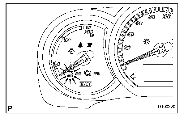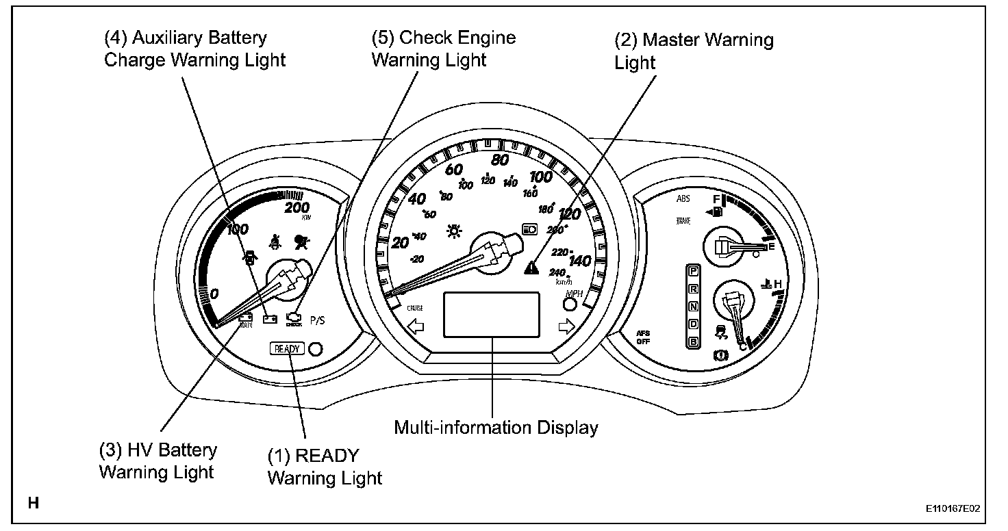 5. Check that the HV system warning light flashers on the multi-information display and the master warning light is illuminated in the combination meter.
